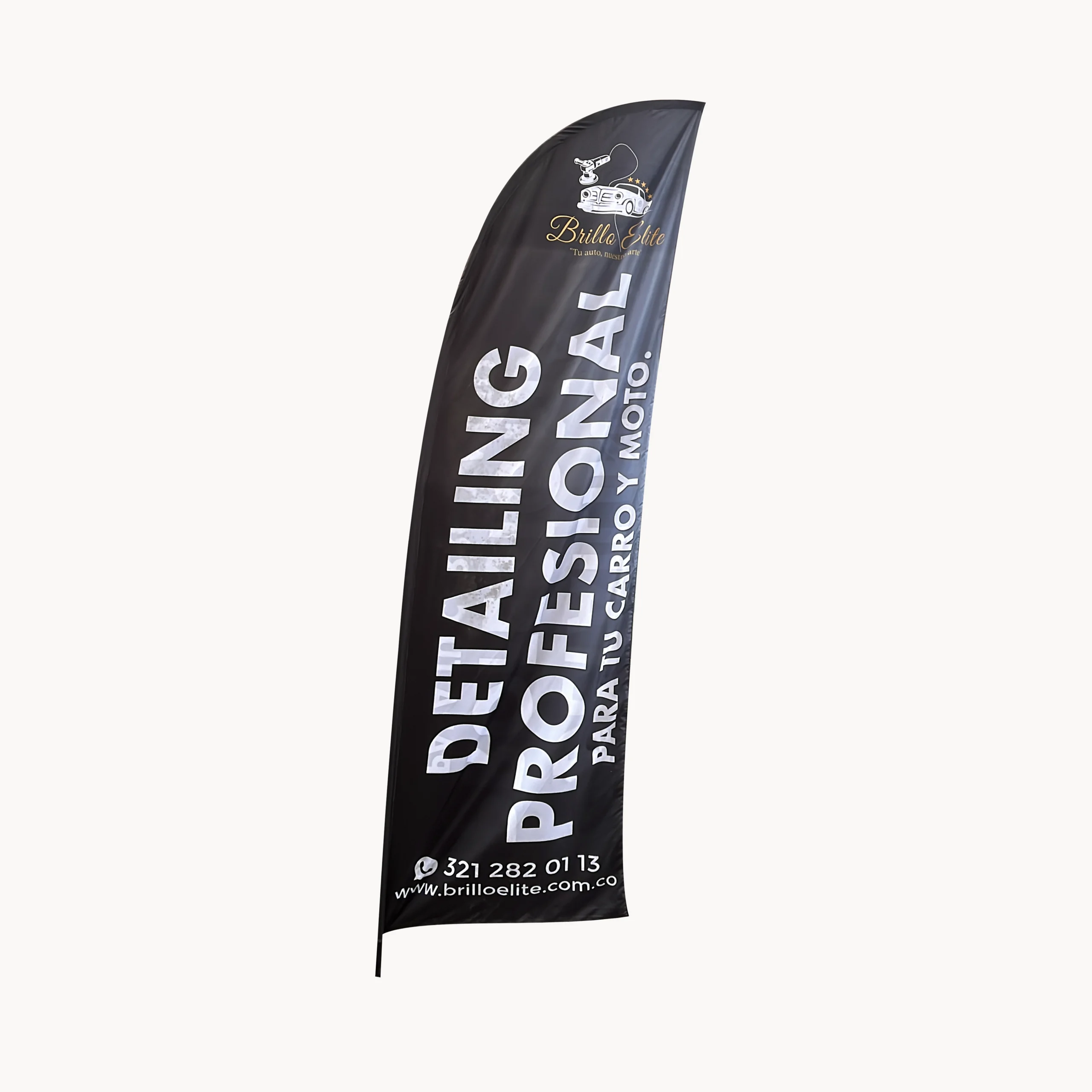 Bandera publicitaria tipo vela personalizada con impresión full color en tela impermeable de alta resistencia. Ideal para exteriores, negocios y eventos que buscan mayor visibilidad y promoción de marca. Incluye diseño exclusivo y excelente durabilidad frente al clima.